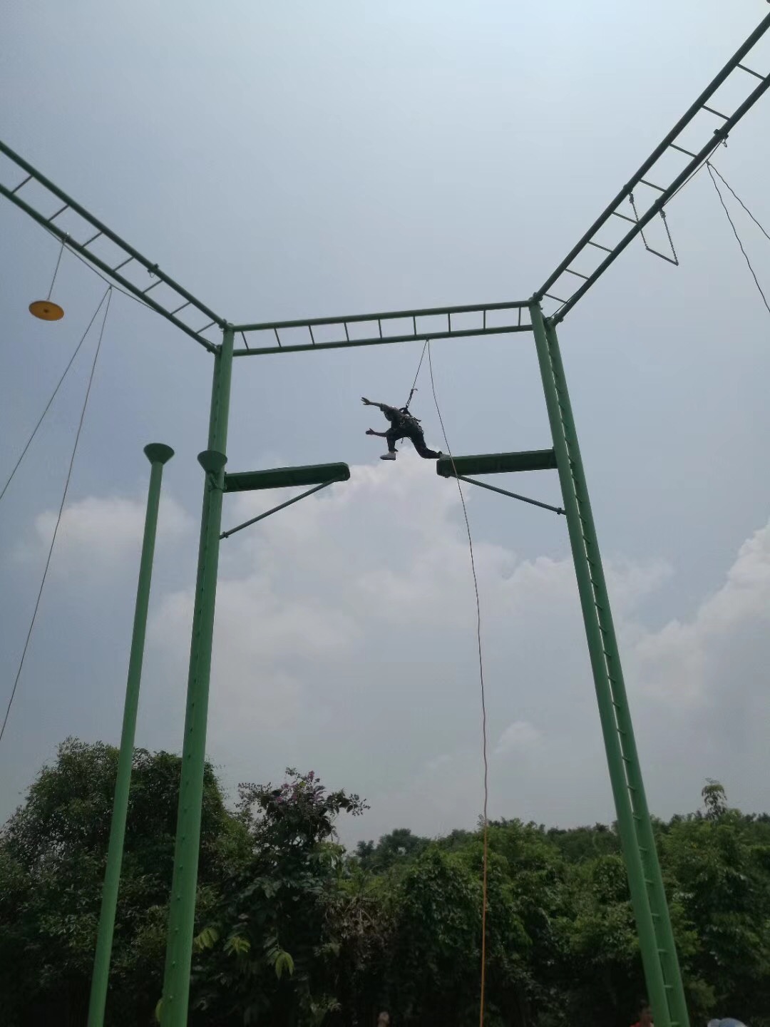 空中單杠是一項自我挑戰的高空高難度項目,隊員需要在9米高臺,直徑25公分的圓臺上站立,奮力跳躍抓住空中的單杠。挑戰自我,客服心理障礙,培養自信心。面對機遇,能果斷把握,增強自我決斷的能力,以積極冷靜的心態去爭取。樹立對困難、對問題不懼不卻以及挑戰的魄力。